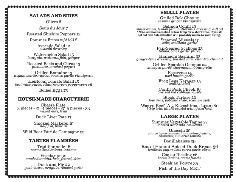 The wine menu is focused on small European winemakers who adhere to a natural, handmade approach to winemaking: little or no added sulfites, natural yeasts and the use of no pesticides.